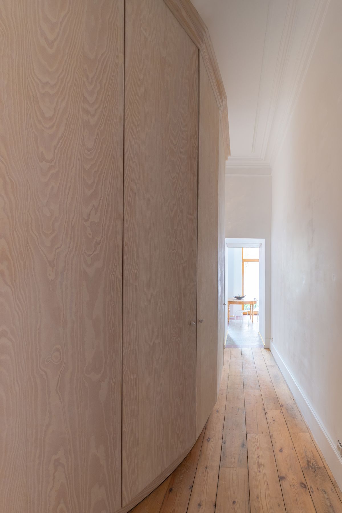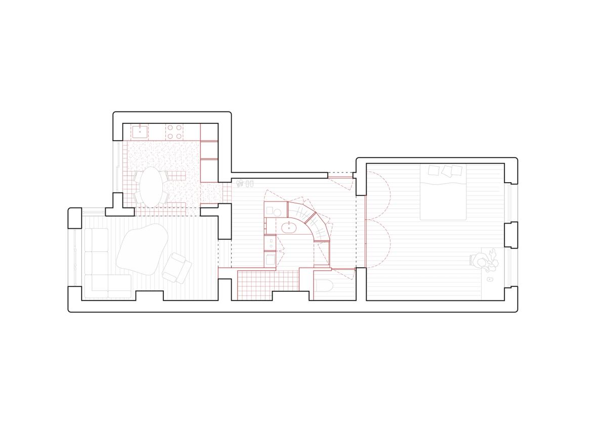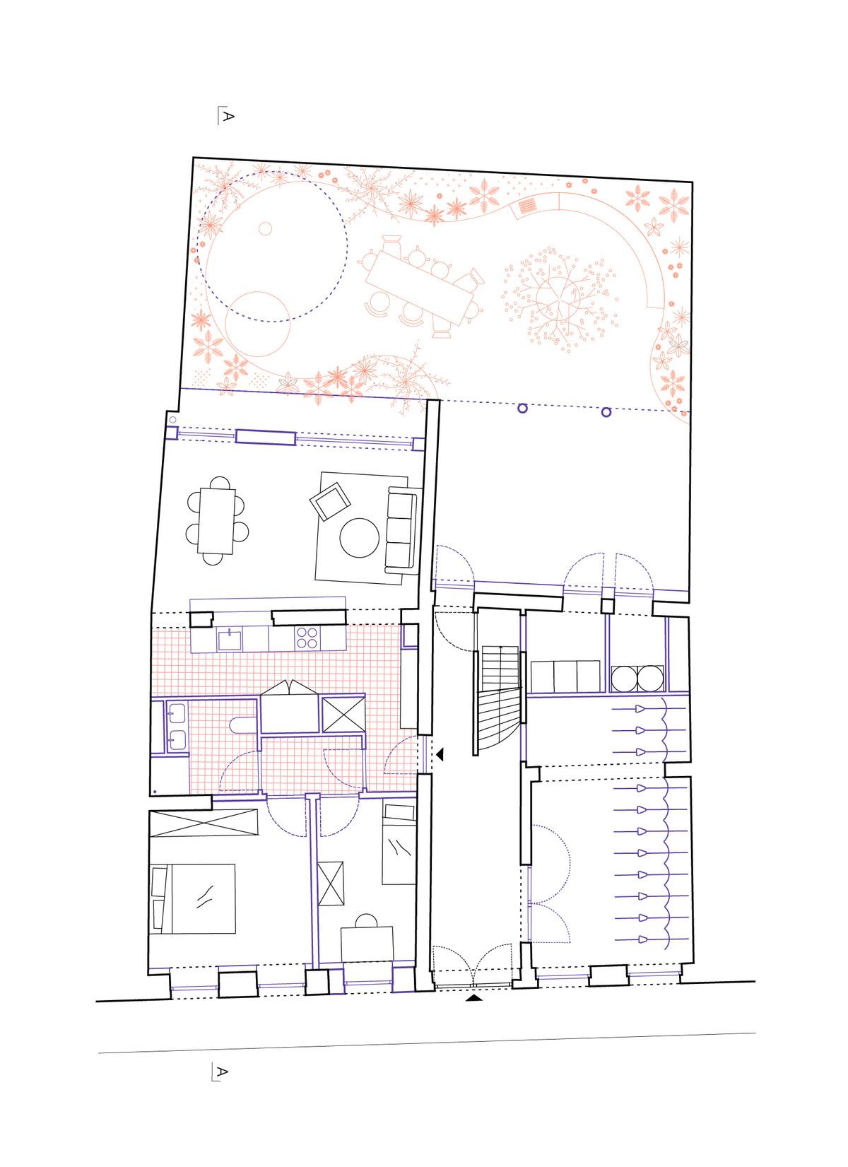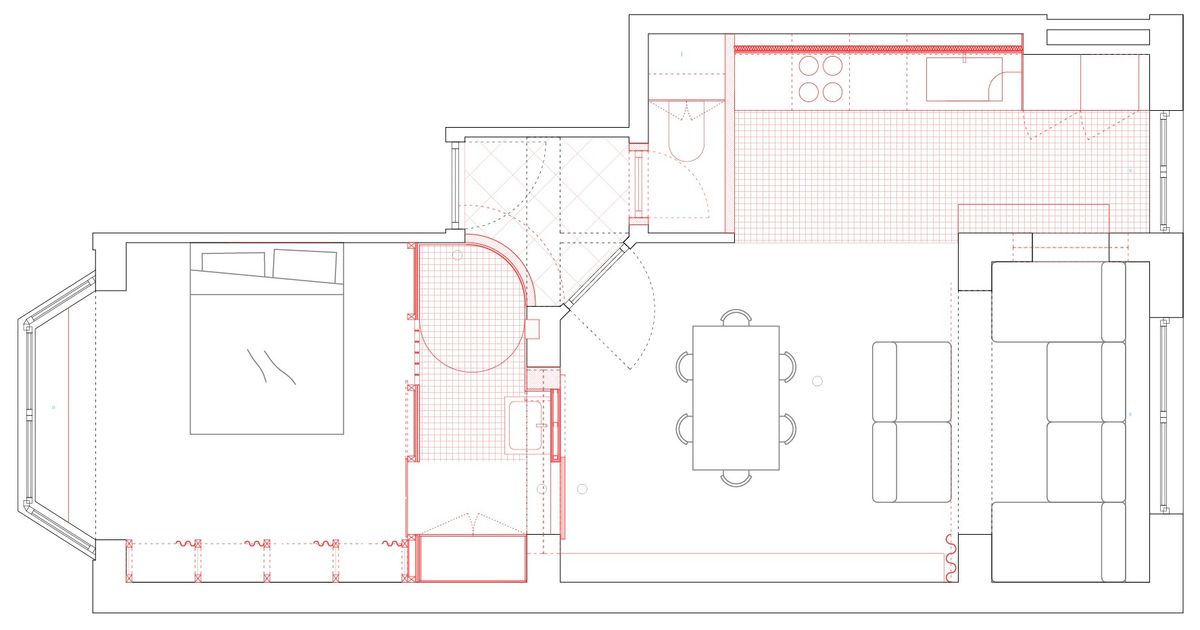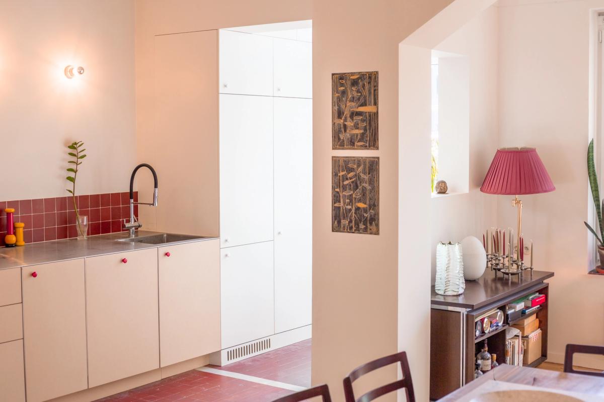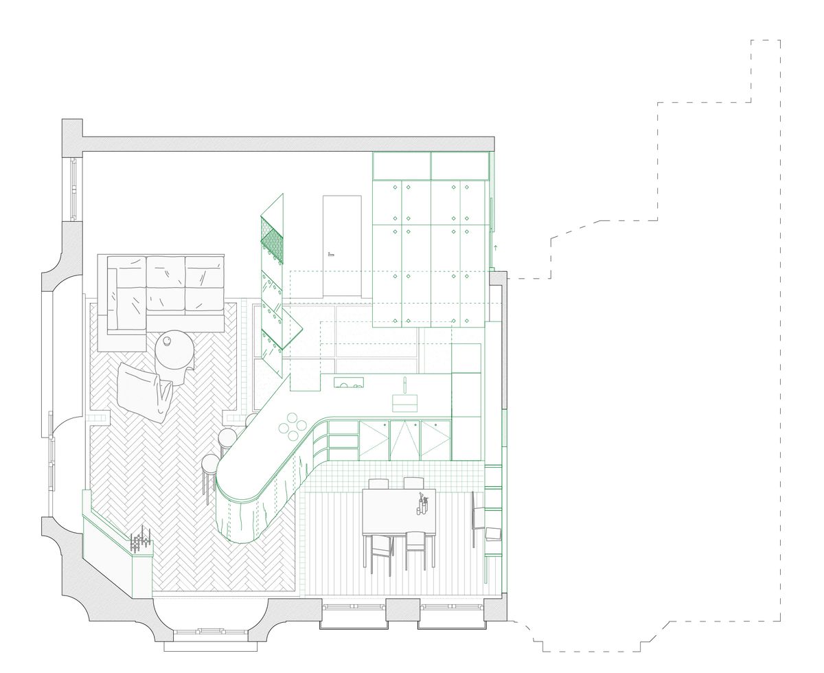 The extension also frees up space in the current –very cramped– kitchen, thereby opening the living space to the outside and creating a two-sided apartment.