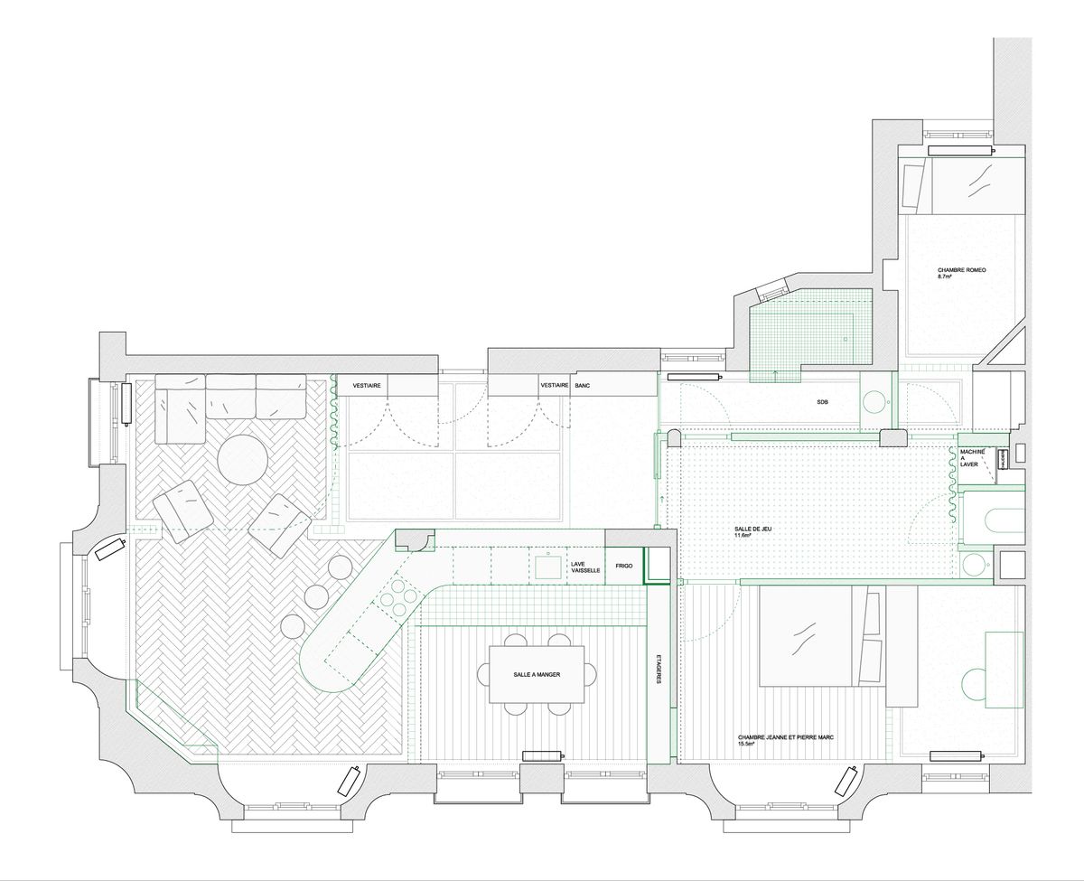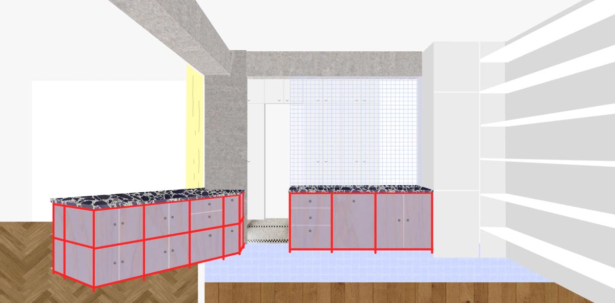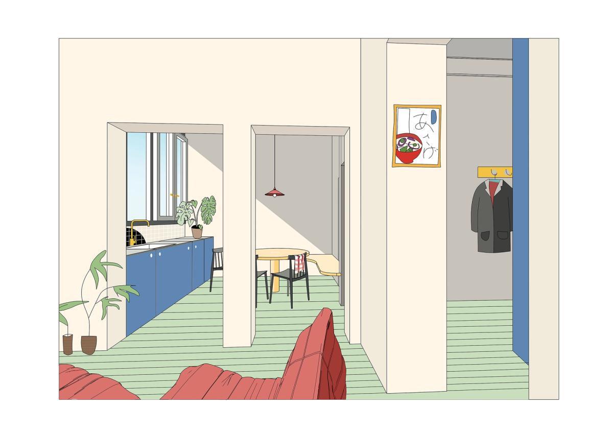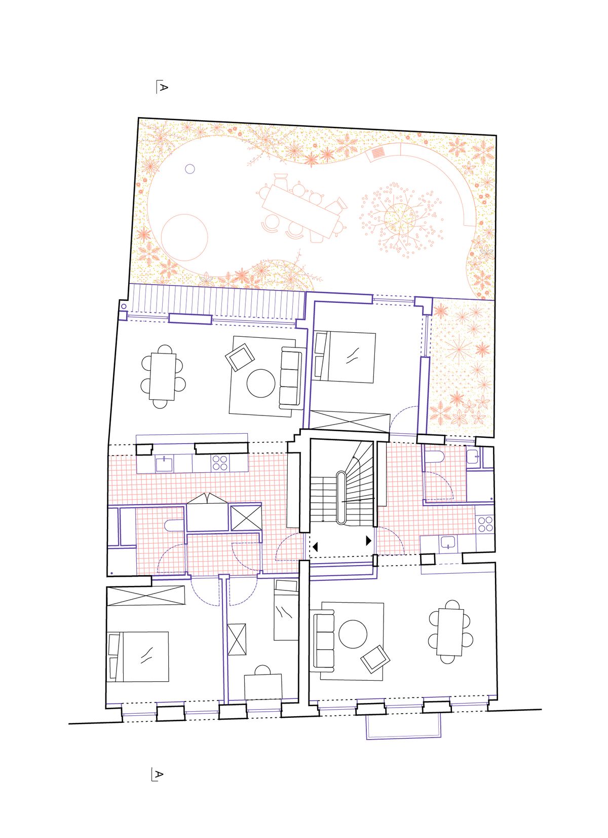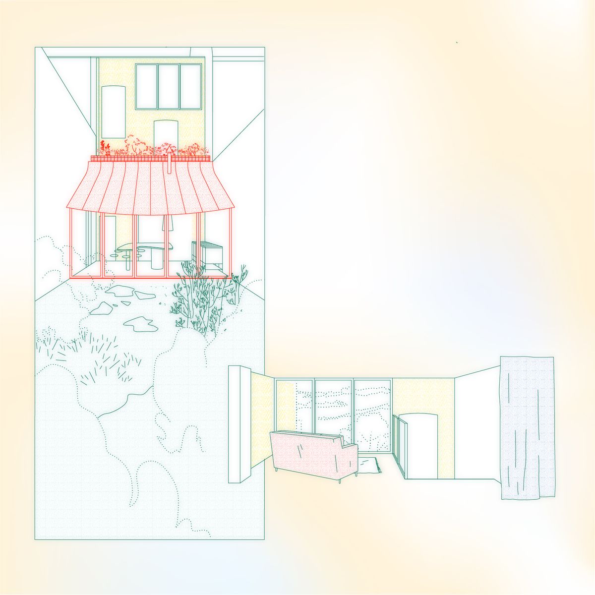 The extension also frees up space in the current –very cramped– kitchen, thereby opening the living space to the outside and creating a two-sided apartment.