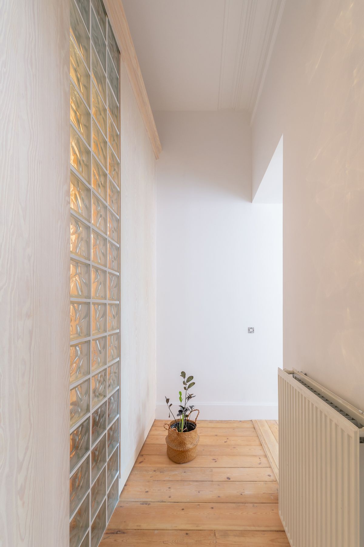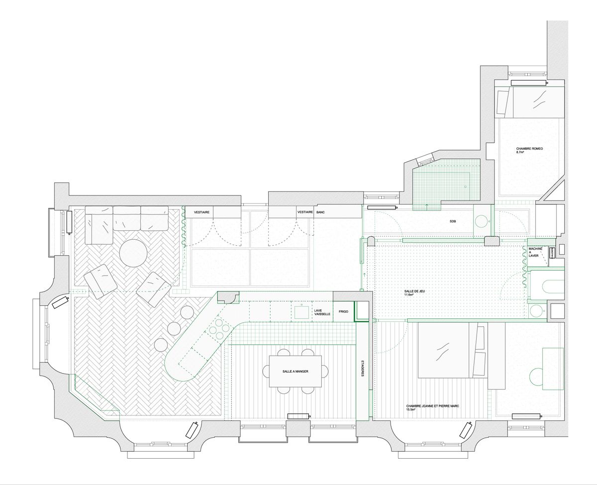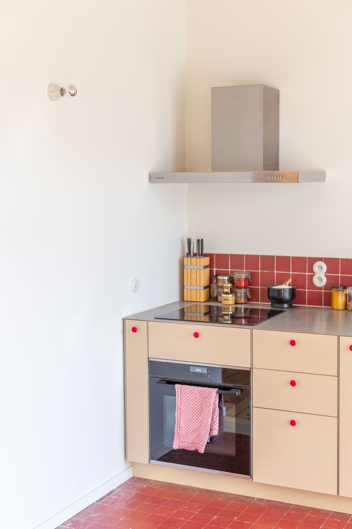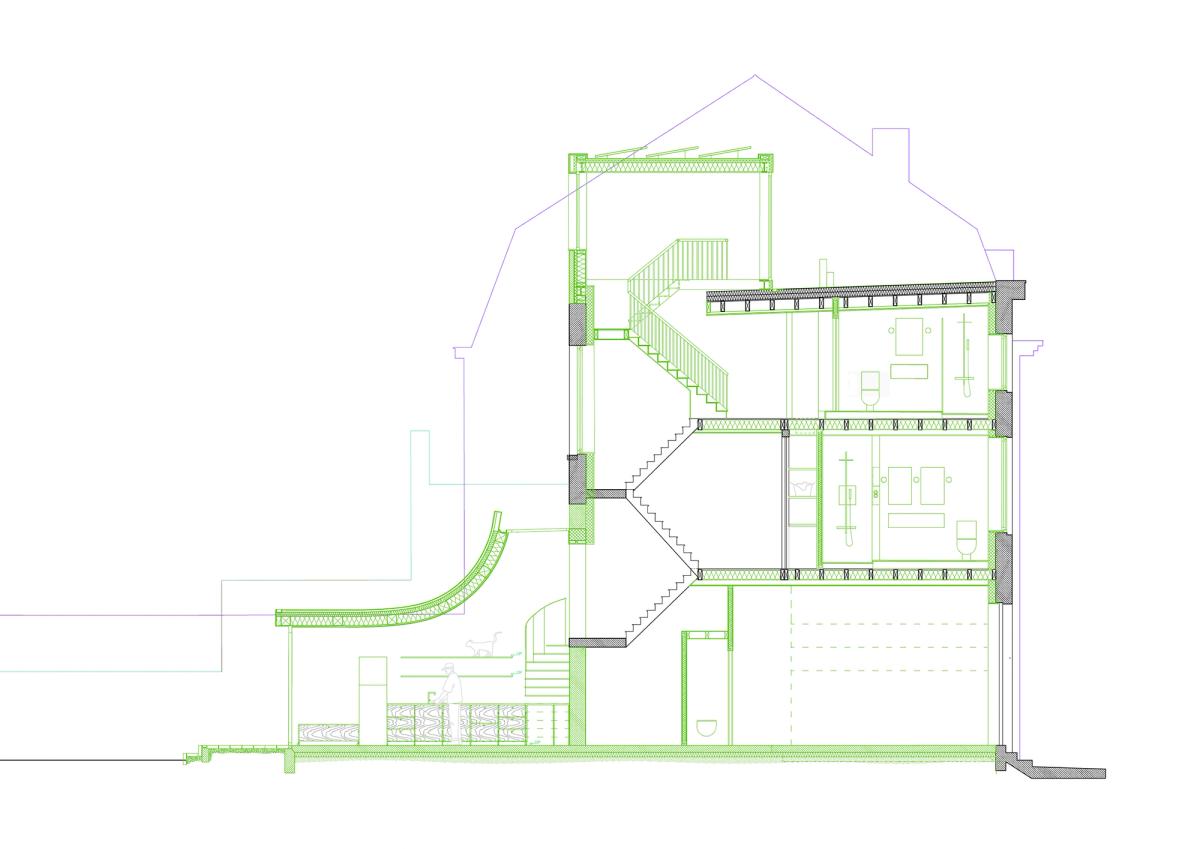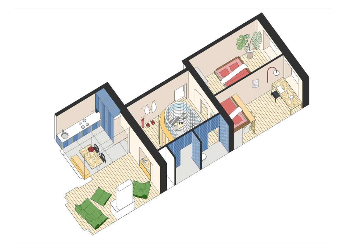 The extension also frees up space in the current –very cramped– kitchen, thereby opening the living space to the outside and creating a two-sided apartment.