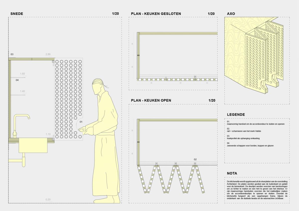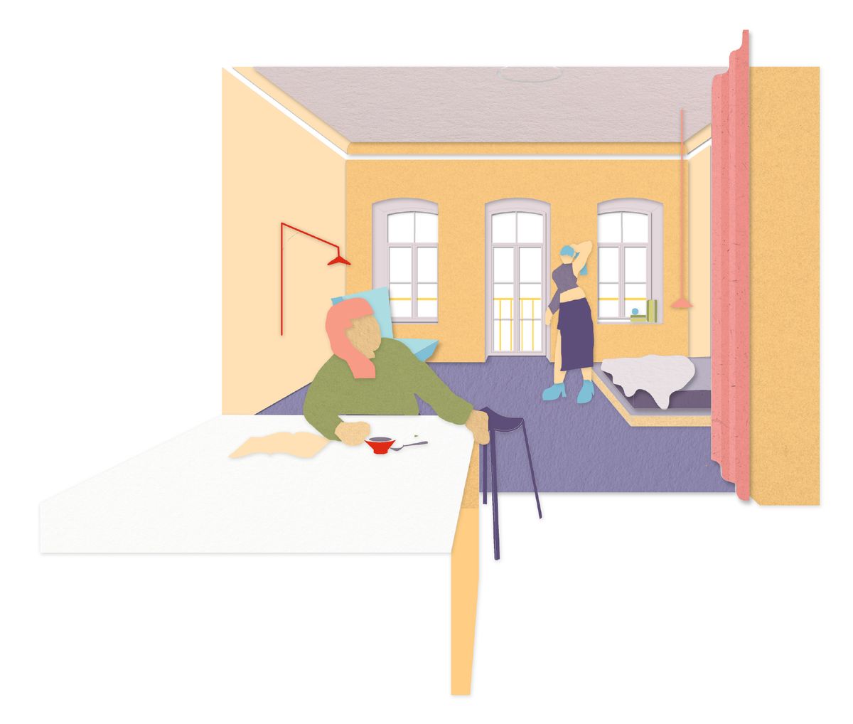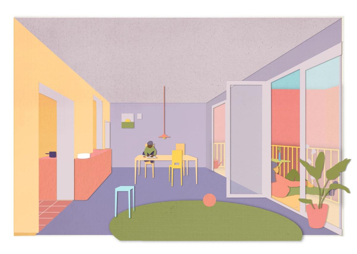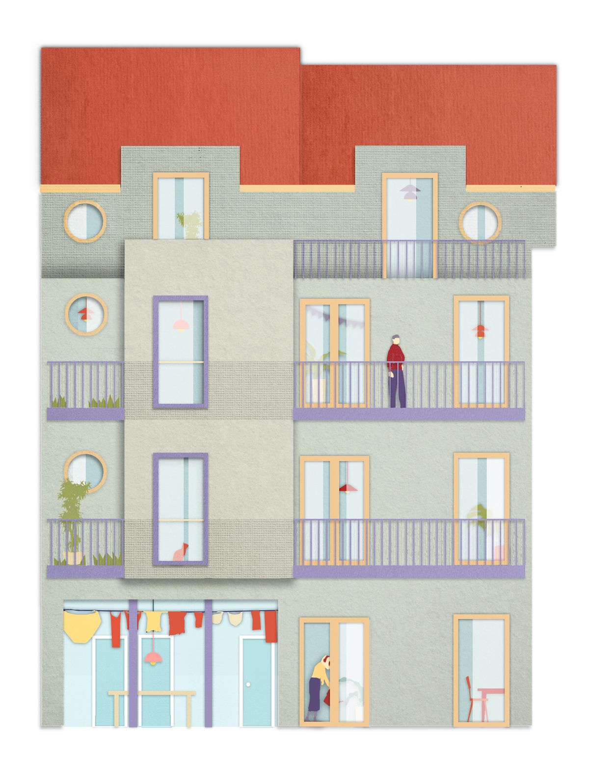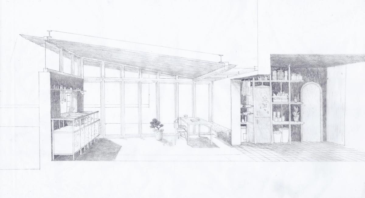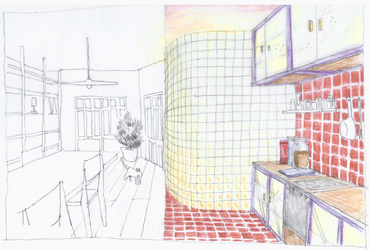 The extension also frees up space in the current –very cramped– kitchen, thereby opening the living space to the outside and creating a two-sided apartment.